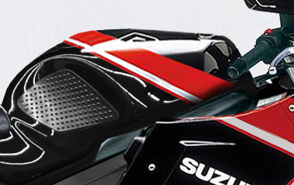 シンプルなリボンのみで構成された統一されたトーンの色調変化が面白く、指し色にくすんだ赤(エクスターの赤)を使うなど、SUZUKIへの愛情があふれています。