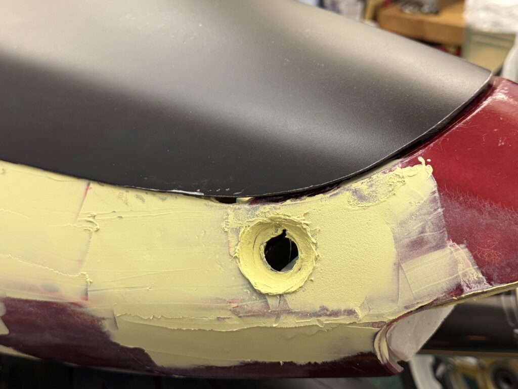 12Rのオリジナルのシートカウルは、私が思っていたよりも丸く出来ており、実物にはハッキリしたエッジが表れないので、あえてこの線に沿ってパテ盛りし、人工的な折り返しのラインを作ってやります。